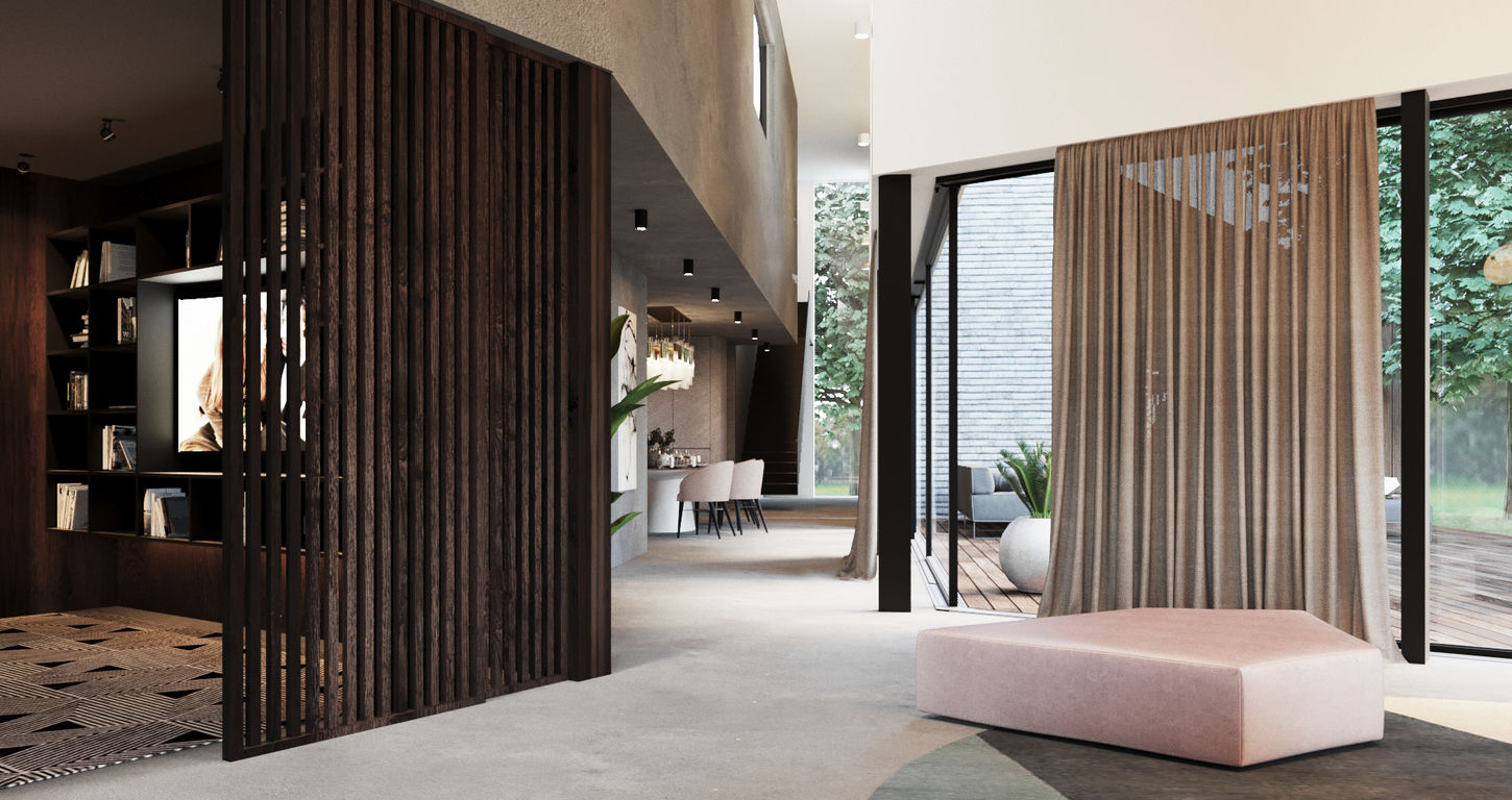 The large north façade becomes completely blind and shows only a sculptural entry inviting to the interior of the house. The whole villa opens towards an interior terrace that becomes the generator of the private life of the house. The internal spaces are in permanent communication between them by inner glazed windows and by a ‘central avenue’. All living spaces are designed on one level, except the master suite, which is protected from outside looks and has an interior patio on the first floor.